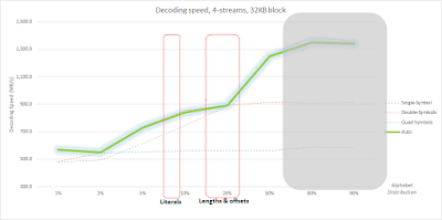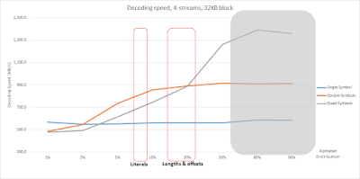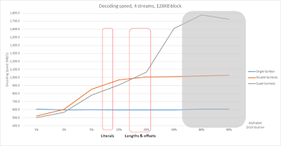 At 128 KB, symbol decoding dominates. It makes the quad-symbols version slightly better compared to double-symbols. Not necessarily enough, but still an alternative to consider when the right conditions are met.